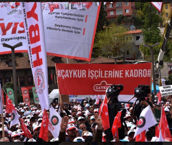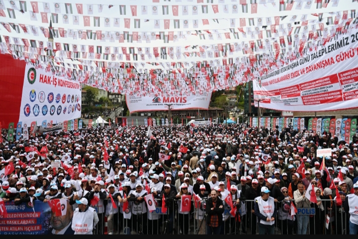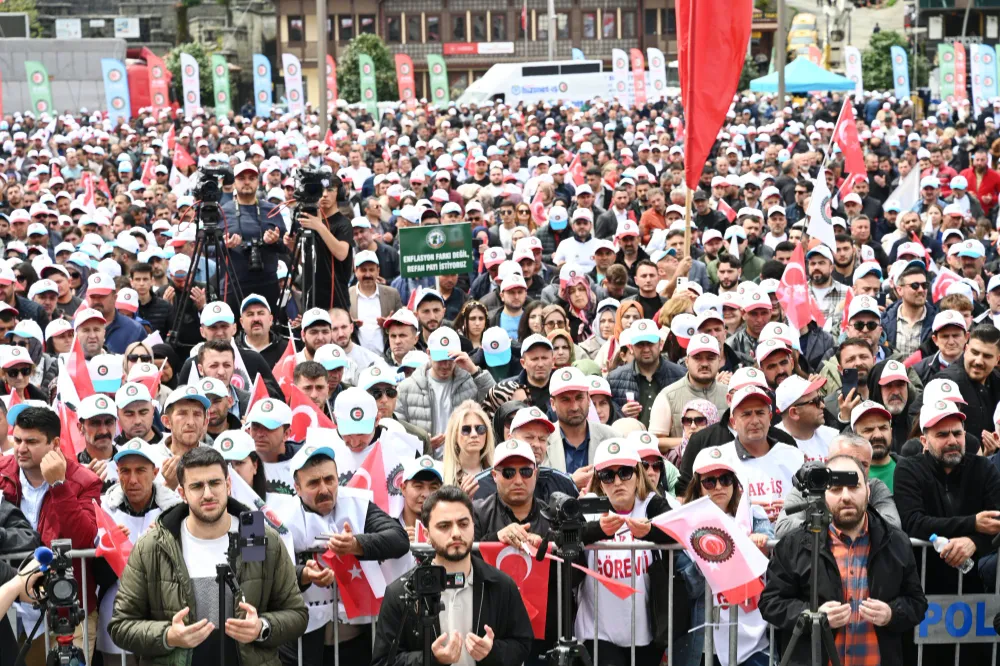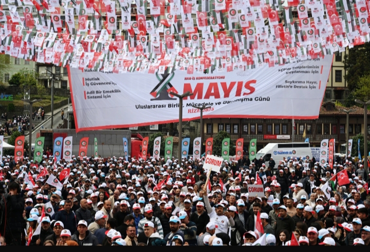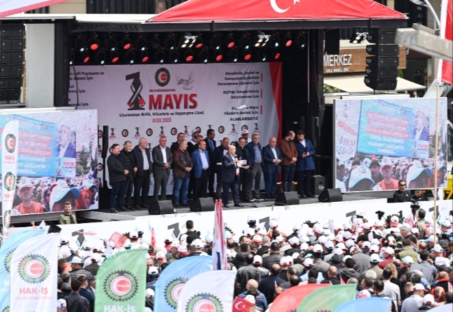 Rize 15 Temmuz Demokrasi meydanında gerçekleşen miting alanını, emekçilerin taleplerini yansıtan büyük afişlerle süslendi. “Ücretlerden Alınan Vergi Oranları Düşürülmeli”, “Sendikal Örgütlenmenin Önündeki Engeller Kaldırılmalı”, “Refahın Adil Paylaşımı ve Vergide Adalet Sağlanmalı”, “Adil Bir Emeklilik Sistemi Sağlanmalı”, “Filistin Bizim Kırmızı Çizgimizdir” gibi mesajlar alanda güçlü bir şekilde yankı buldu. Emekçiler, sık sık “Yaşasın HAK-İŞ, Yaşasın 1 Mayıs”, “Çaykur İşçisi Kadro İstiyor”, “Filistin’e Selam, Direnişe Devam” sloganları attı.