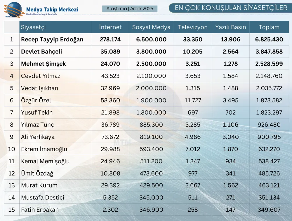 Rapora göre, Cumhurbaşkanı Recep Tayyip Erdoğan siyasi gündemdeki ağırlığını sürdürürken; Devlet Bahçeli, Mehmet Şimşek, Ali Yerlikaya ve Özgür Özel ay boyunca öne çıkan isimler arasında yer aldı.