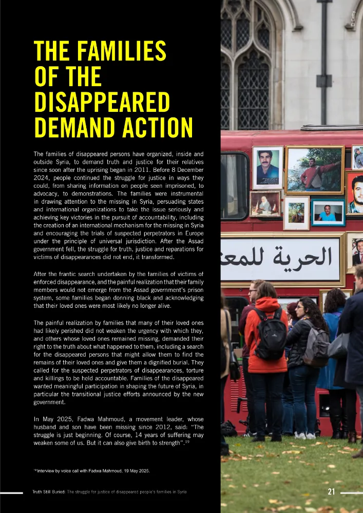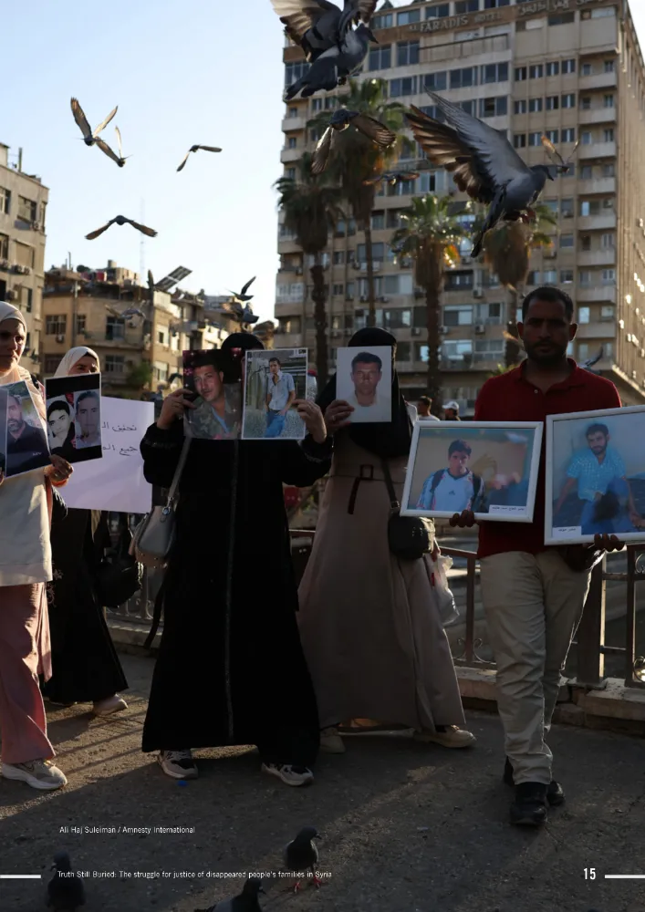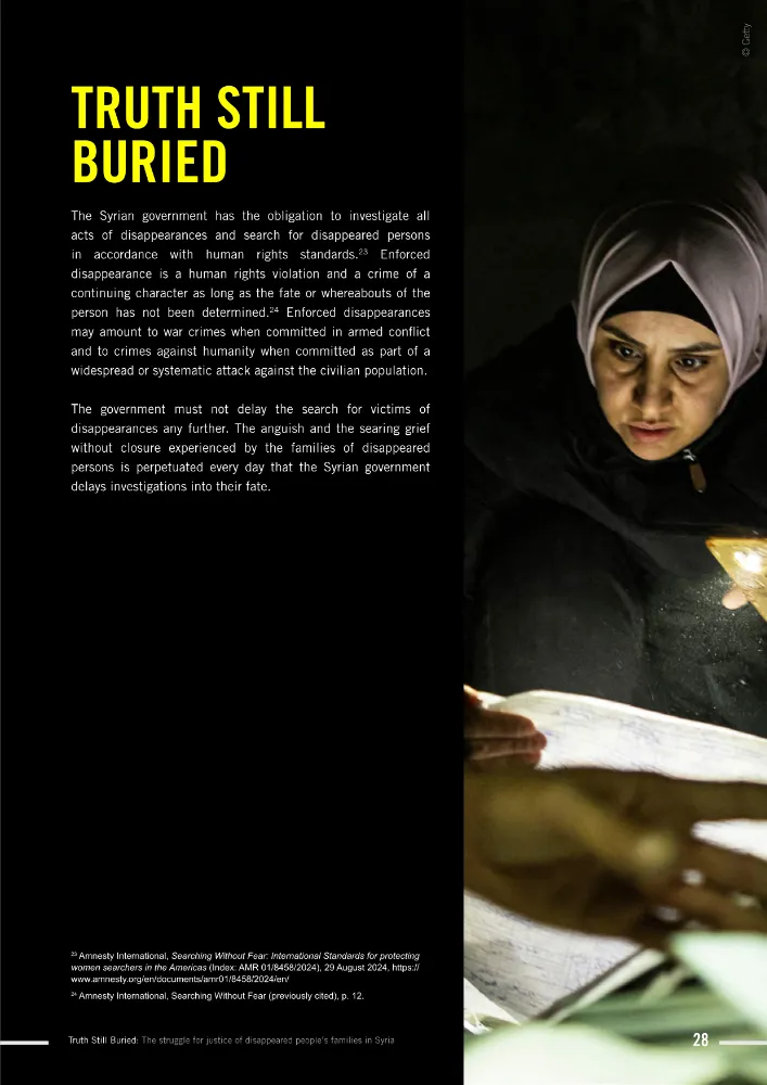 Uluslararası Af Örgütü, 30 Ağustos Uluslararası Zorla Kaybedilme Mağdurları Günü öncesinde yayımladığı ve tanıklarla, aile yakınlarıyla görüşülerek hazırlanan yeni brifinginde, önemli kanıtlar kaybolması veya imha edilmesi nedeniyle şüpheli faillerin serbestçe dolaştığını gören eski tutukluların ve kayıp ailelerinin yaşadığı derin üzüntüyü gözler önüne seriyor. Kayıp ailelerinin ana taleplerinin de yer aldığı araştırmada, Suriye hükümetine kapsayıcı bir ulusal arama mekanizması kurmaya öncelik vermesi için çağrıda bulunuluyor.