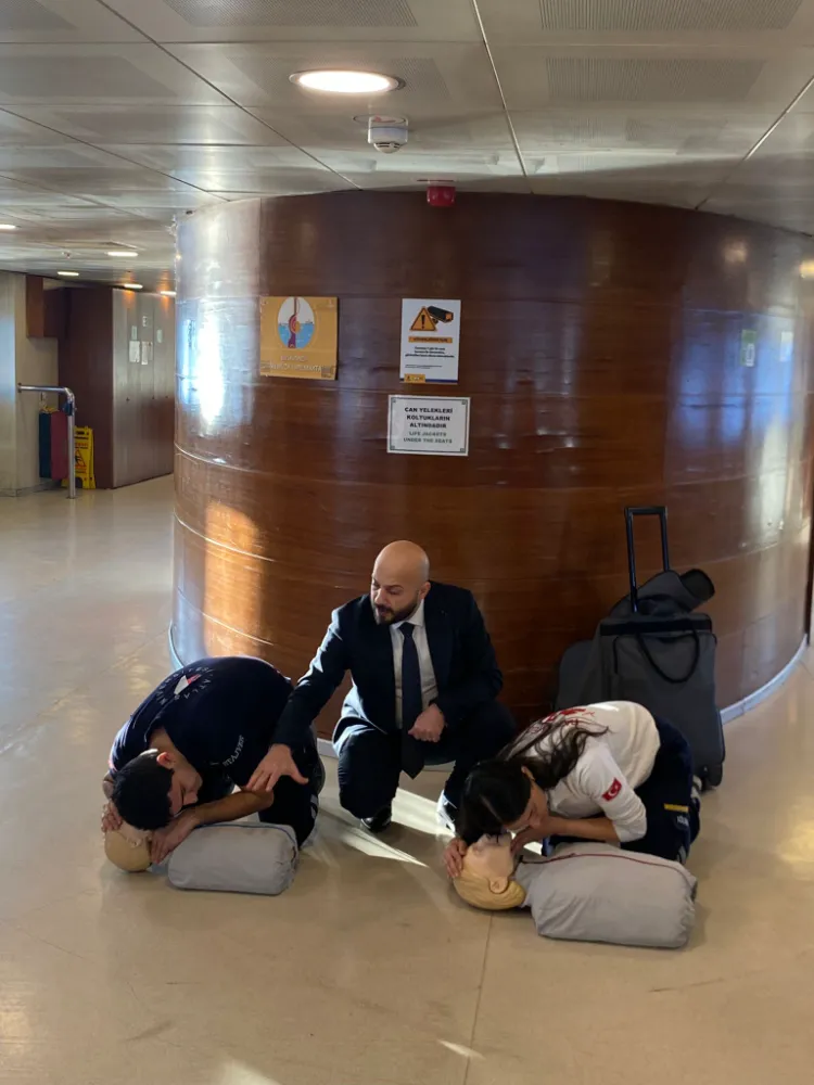 Öğretim Görevlisi Kadir Şeker’in öğrencilerle birlikte maket üzerinde uygulamalı olarak yolculara kalp masajı ve Heimlich manevrasını gösterdiği eğitimde gönüllü yolcular da maket üzerinde kalp masajı yaptı.
