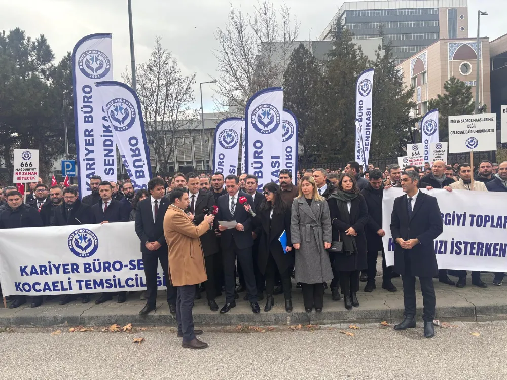 Basın açıklamasında konuşan Kariyer Büro Sendikası Genel Başkanı Tolga Akgül, yıllardır süren bir mağduriyetle karşı karşıya olduklarını belirterek, “Sadece özlük haklarımız için değil; artık yüreklere ağır gelen ama bir şekilde hep araya kaynayan adalet arayışımızın, ciddiyetini göstermek, yitirilmesine ramak kalmış çalışma barışının korunması için artık vakit kalmadığını anlatmak için buradayız” ifadelerini kullandı.
