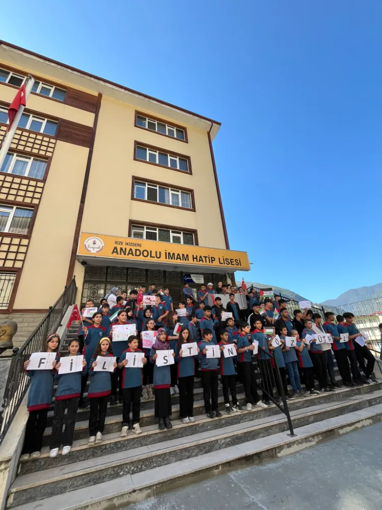 İkizdere İmam Hatip Lisesi Ortaokulu öğrencileri okul bahçesinde yaptıkları programda İsrail’i lanetleyerek tepki gösterdi. Filistin’e özgürlük pankartları ve Türk Bayrağı asarak tepki gösteren öğrencilerin çalışması ilçede memnunlukla karşılandı. İmam Hatip Lisesi öğrencileri’ ’Filistin yalnız değildir. Dünyanın bu zulmü görmesini ve yapılan katliamı durdurması ile Gazze insanının yurduna dönmesini istiyoruz. Çocuklar dünyanın geleceğidir. Katliamlara dur denilmeli’’ dediler.