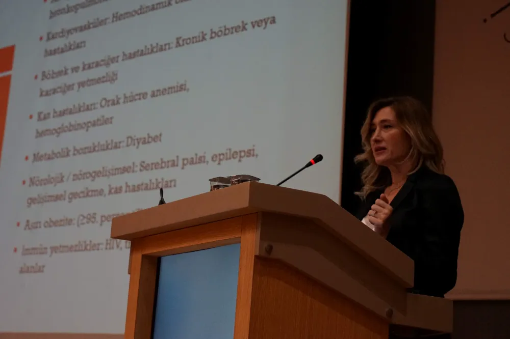 Gebelik döneminde aşılamanın önemine dikkat çeken Dr. Öğr. Üyesi Zeynep Eran, “Riskli grupta gebeler var. Gebelerde ciddi riskler oluşabilir. 1918- 1919, 1957-1958 ve 2009 -2010 yıllarında meydana gelen pandemilerde de gebe kayıpları gözlenmiş. Gebelerin influenza dönemlerinde hastaneye yatış oranları da diğer dönemlere göre iki kat daha fazla. En yüksek hastaneye yatış ilk üç ayda ve doğuma yakın zamandaki dönemde gerçekleşiyor. Kronik hastalığı olan gebelerde hastaneye yatış oranı sağlıklı gebelere oranla daha fazla. Peki bizim gebe bağışıklık hedeflerimiz ne? Hamilelik sırasında anne ve fetüsü korumamız lazım. Bu durumda annenin aşılanması öneriliyor. Doğumdan sonraki haftalarda anne sütüyle beraber 6 ay boyunca antikor bebeği koruyacaktır” diye konuştu.