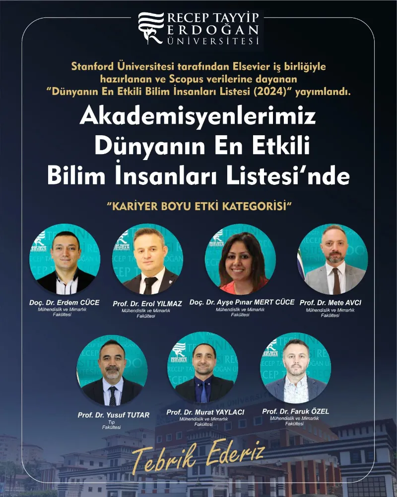 Recep Tayyip Erdoğan Üniversitesi Öğretim Üyeleri, Prof. Dr. Mete Avcı, Prof. Dr. Murat Yaylacı, Prof. Dr. Yusuf Tutar, Prof. Dr. Erol Yılmaz, Prof. Dr. Abdullah Altunışık, Prof. Dr. Fatih Gül, Prof. Dr. Faruk Özel, Doç. Dr. Erdem Cüce, Doç. Dr. Mustafa Ergin Şahin, Doç. Dr. Pınar Mert Cüce, Doç. Dr. Burhan Başaran ve Doç. Dr. Muhammet Aydın 2025 yılı verileri dikkate alınarak hazırlanan "En Etkili Bilim İnsanları" listesine girdi. Öte yandan Öğretim Üyelerimiz Prof. Dr. Mete Avcı, Prof. Dr. Yusuf Tutar, Prof. Dr. Erol Yılmaz, Prof. Dr. Murat Yaylacı, Prof. Dr. Faruk Özel, Doç. Dr. Erdem Cüce ve Doç. Dr. Pınar Mert Cüce yaşam boyu kariyer verileri dikkate alınarak hazırlanan "Kariyer Boyu Etki" listesinde yer aldı.
