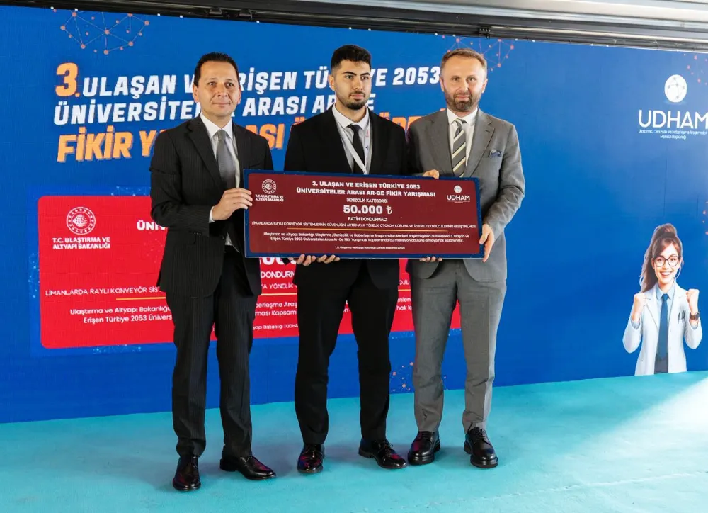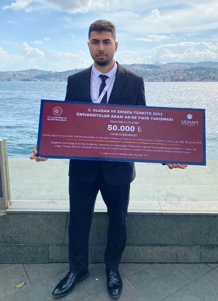 RTEÜ Turgut Kıran Denizcilik Fakültesi öğrencisi Fatih Dondurmacı, “3. Ulaşan ve Erişen Türkiye 2053 Üniversiteler Arası Ar-Ge Fikir Yarışması”nda “Denizcilik” kategorisinde, en enerjik mansiyon ödülü aldı. RTEÜ Öğrencisinin, “Limanlarda Raylı Konveyör Sistemlerinin Güvenliğini Artırmaya Yönelik Otonom Koruma ve İzleme Teknolojilerinin Geliştirilmesi” başlıklı projesi ile geliştirilecek entegre sistem, gemi yaklaşma süreçlerinde ve yük operasyonları sırasında yaşanabilecek kazaları önlemeyi; hem liman personelinin güvenliğini hem de gemi ve liman ekipmanlarının korunmasını sağlayacak. Ayrıca, operasyonel kesintilerin azalmasıyla birlikte sistem genelinde verimlilik artışı da hedefleniyor.