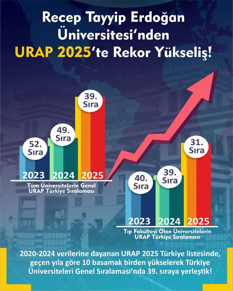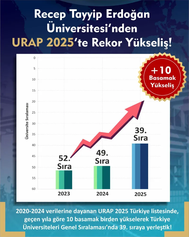 Rize, 19 Ekim 2025– Recep Tayyip Erdoğan Üniversitesi (RTEÜ), üniversite sıralamalarının bilinen adresi URAP'ın 2025 Türkiye listesinde adeta fırtına gibi esti! 2020-2024 yıllarını kapsayan ve bugün açıklanan analizde RTEÜ, tam 10 basamak birden yükselerek başarı hikayesine yeni bir sayfa ekledi.