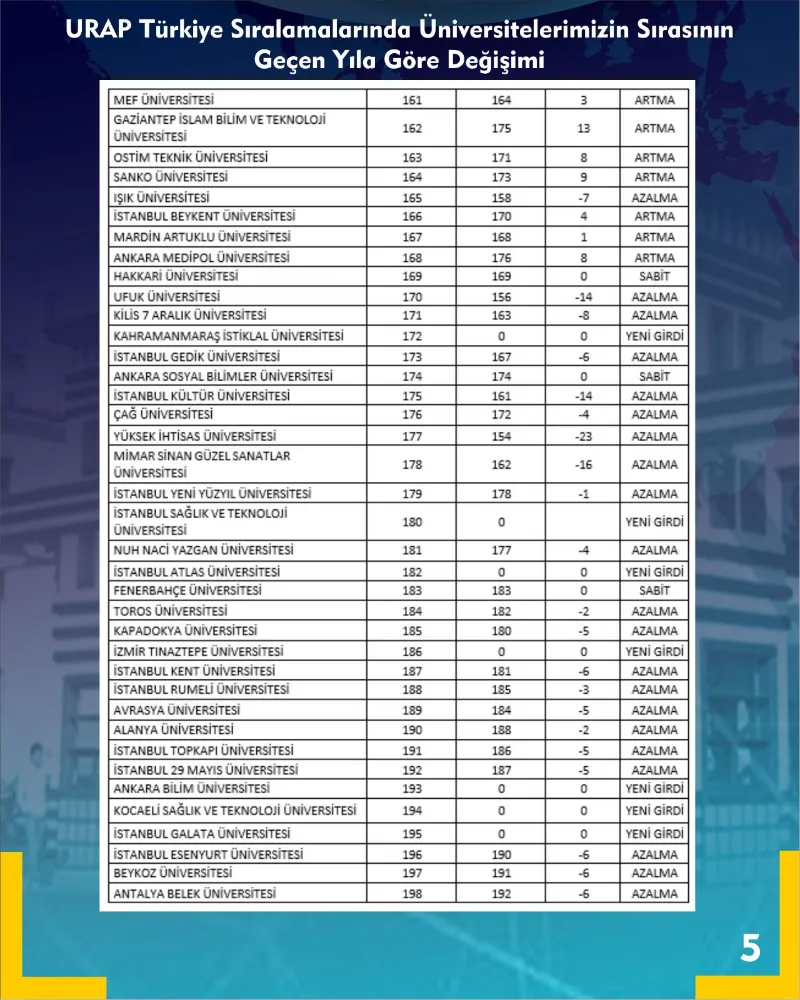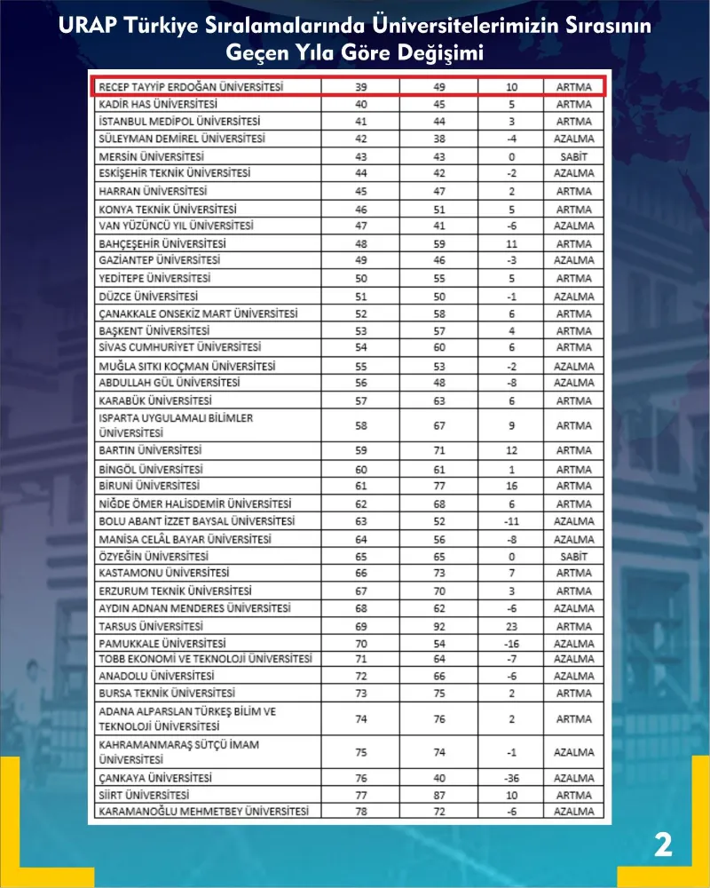 Geçtiğimiz yılki URAP 2024 sıralamasında (2019-2023 dönemini inceleyen) RTEÜ zaten 3 basamaklık bir ivmeyle dikkat çekmişti. Üniversite Rektörü Prof. Dr. Yusuf Yılmaz, URAP 2024’teki yükselişin büyük ölçüde 2023 yılındaki iyi performanstan kaynaklandığını vurguluyor. Ancak rektör Yusuf Yılmaz, önceki dört yılın verilerinin ne yazık ki olumsuz etkilediğini belirterek, "Görev süremizi içeren daha çok yılın analizlere dahil edilmeye başlanmasıyla müthiş değişim gözle görülür hale geliyor" dedi. Heyecanını gizlemeyen Prof. Dr. Yılmaz, geleceğe dair umut dolu sözlerle devam ediyor: "2025 yılı verilerimiz çok daha iyi. URAP 2026'daki yerimizin çok daha iyi olacağını, RTEÜ’nün zirve yolculuğunun başladığını şimdiden ilan ediyorum!"