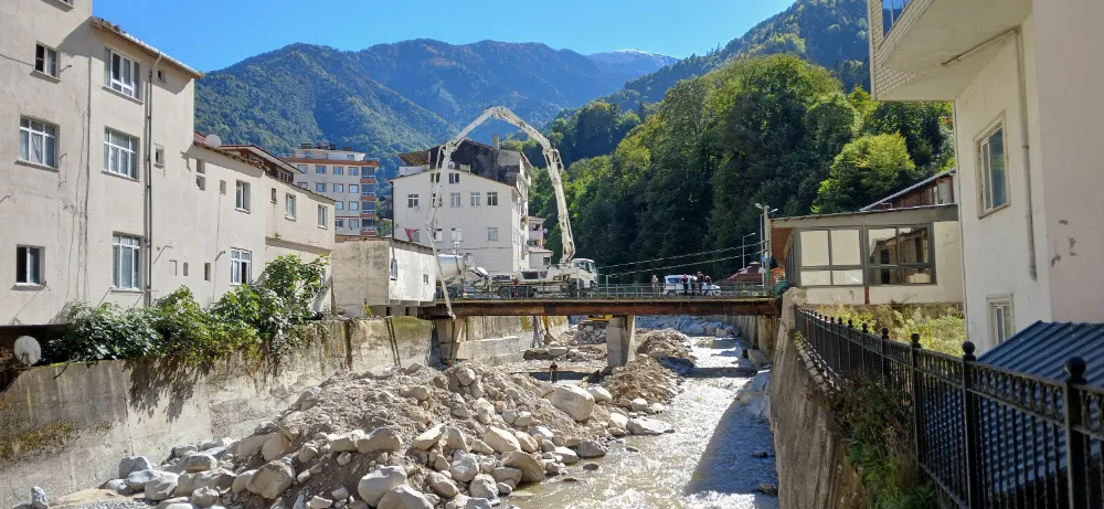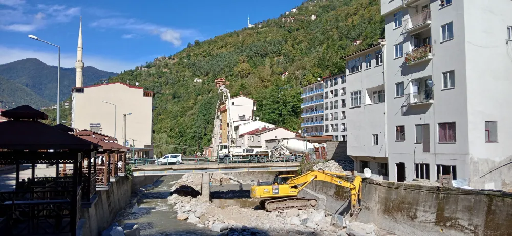İkizdere ilçe merkezinde ve İkizdere deresi üzerinde bulunan beton köprünün dere taşkınından zarar görmemesi ve altının dere taşkınıyla gelecek taş çakıl vs. ile tıkanmaması için DSİ tarafından ayakların her iki tarafında zemin betonlanıyor. Dere yatağı zeminine yapılan beton ile derenin taşkınlarda köprüye ve çevreye zarar vermesi önlenmiş olacak.