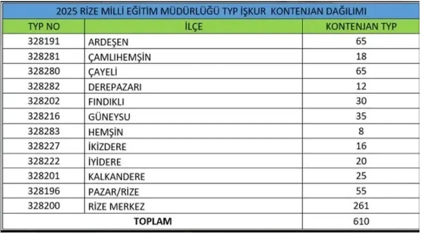 İŞKUR Rize İl Müdürlüğü’nden yapılan açıklamada, kamu hizmetlerinin desteklenmesi amacıyla başlatılan TYP kapsamında, Rize genelinde 610 kişilik kontenjan ayrıldığı bildirildi.