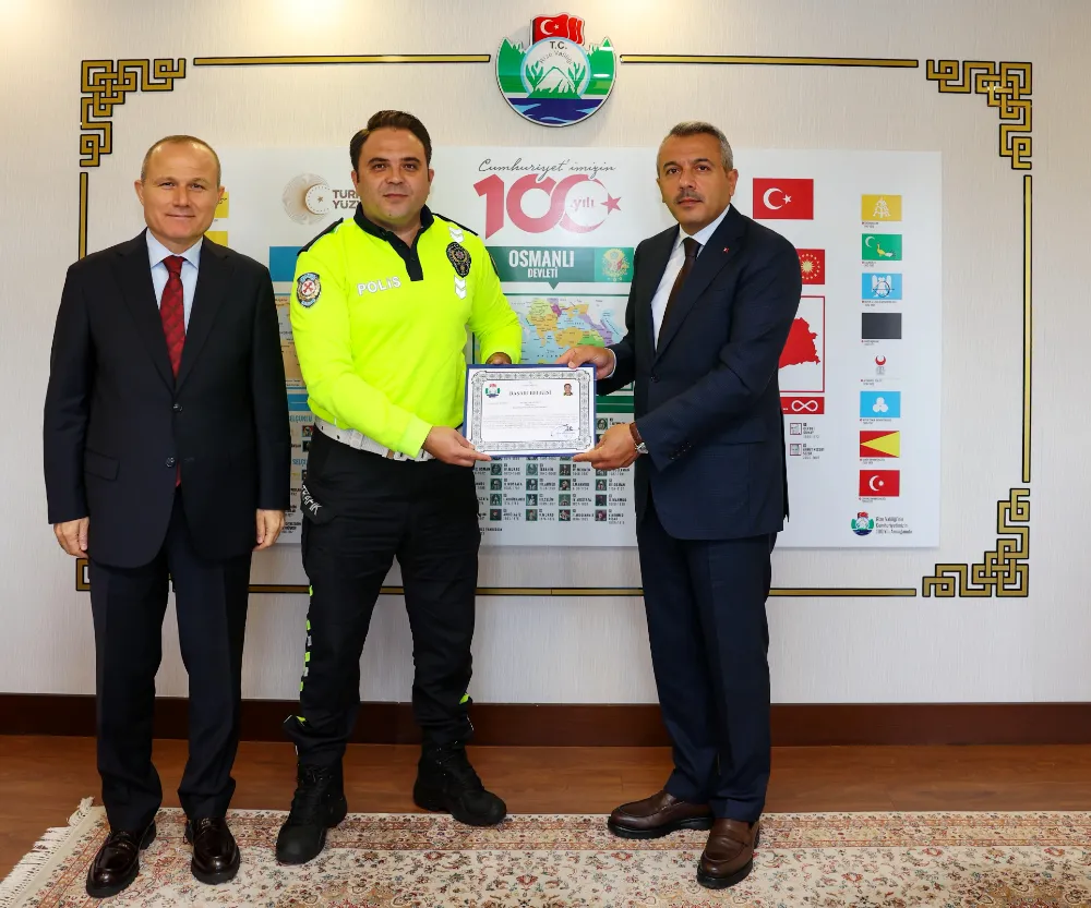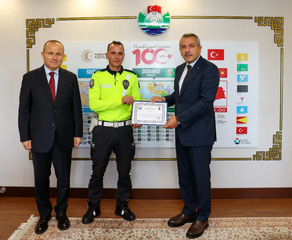 Olay anına tanıklık eden, Rize Valisi Baydaş, gösterdikleri görev bilinci ve özverili çalışmalarından dolayı Bölge Trafik Denetleme Şube Müdürü Başkomiser Akif Karaduman ile Polis Memuru Fatih Öztürk'ü beraberinde İl Emniyet Müdürü Murat Türesin ile bilikte makamında kabul ederek başarı belgesi takdim etti.