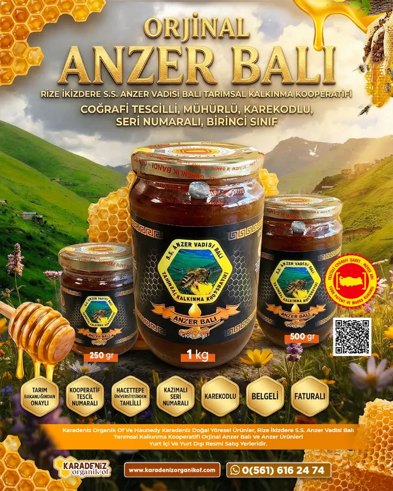 Anzer Vadisi Balı Tarımsal Kalkınma Kooperatifi Başkanı Murat Gür burada yaptığı açıklamada; “Kooperatifimizin anzer balları, coğrafi tescilli, mühürlü, kazımalı seri numaralı, karekodlu, Hacettepe Üniversitesi’nden tahlilli, barkodlu, Kooperatif tescil numaralı, Tarım Bakanlığımızca onaylı ballardır. Bilimsel olarak da üniversitelerimizde kürsüleri ve araştırma enstitüleri bulunan, dünyanın en iyi en şifa balı Coğrafi Tescilli Mühürlü Anzer ballarımız, 1 kg, (970 gr.), 500 gr ve 250 gramlık olarak, Trabzon Sürmene Yeniay’da bulunan Haunedy Karadeniz Yöresel Ürünler Mağazasında satılmaktadır. Kooperatifimizi tercih ettikleri için işletme sahibi Ali Rıza Köroğlu ve İşletme Müdürü Yasin Köroğlu’na teşekkür ediyorum. Anzer Balımız, Anzer Yaylamızda bulunan 100 den fazlası endemik, 500 civarında çeşit çiçekten arıların elde ettikleri en doğal, en şifa, besin değeri en yüksek, en kaliteli baldır.” dedi.