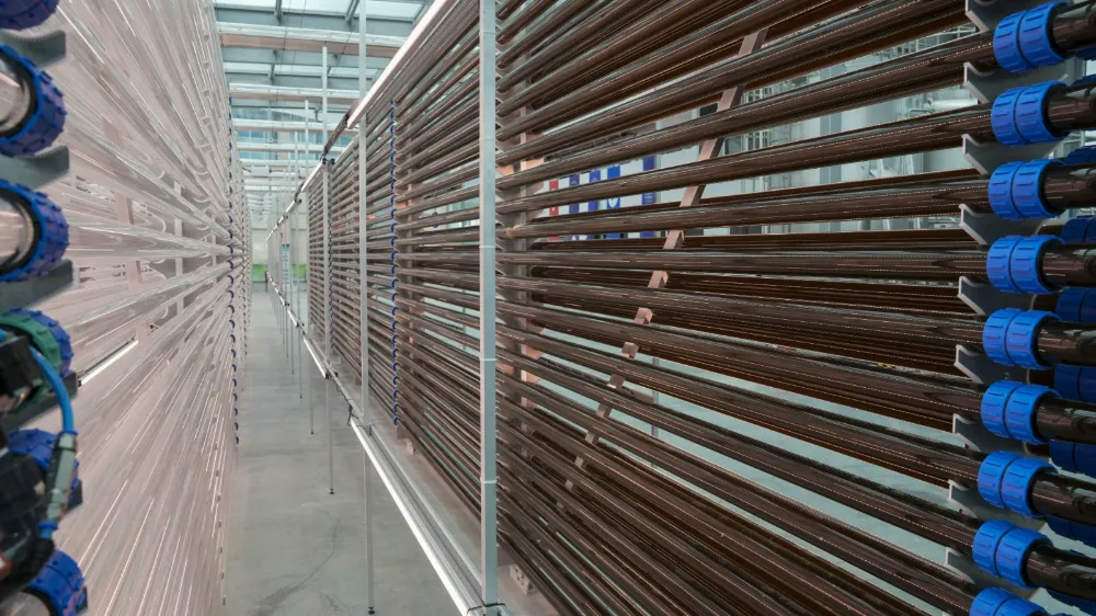üretli ebilmesi için hibrit bir yetşi tri me sistemi uygulanıyor. Mikroalgler, doğal ışık ve yapay LED