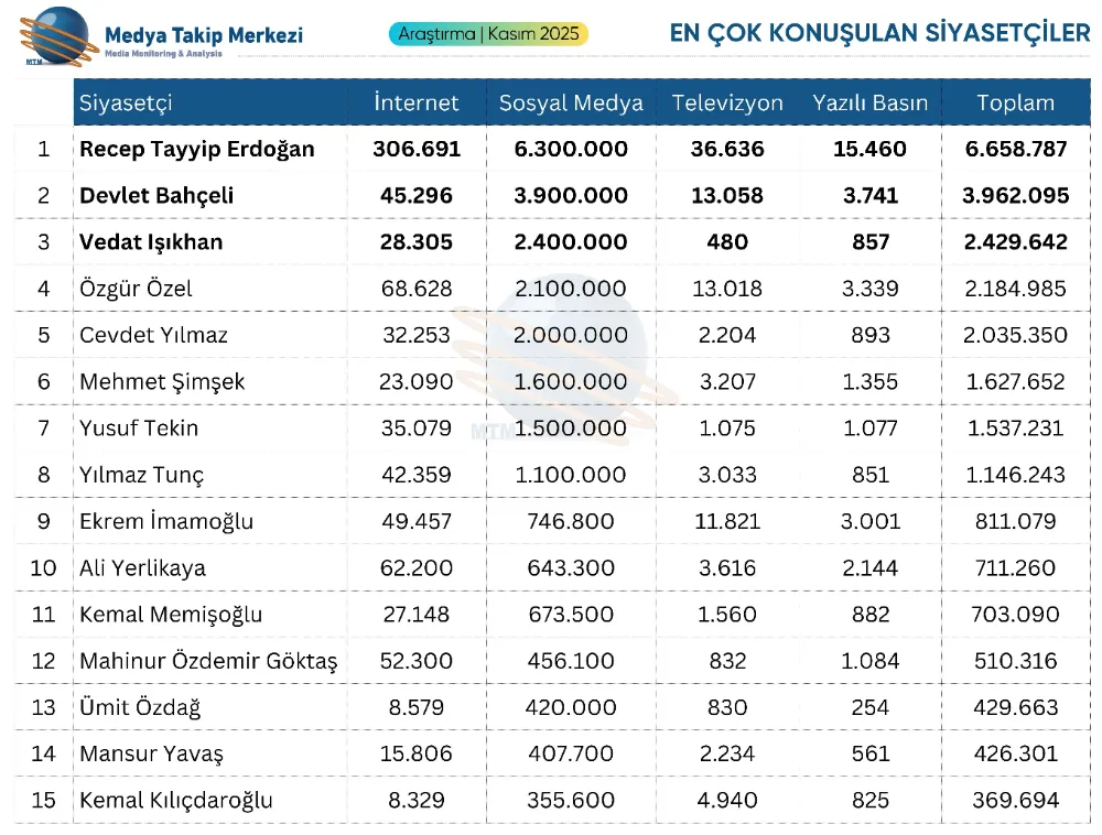 MTM Medya Takip Merkezi Kasım 2025'in en çok konuşulan siyasetçilerini araştırdı. Rapora göre, Cumhurbaşkanı Recep Tayyip Erdoğan siyasi gündemdeki ağırlığını sürdürürken; MHP Genel Başkanı Devlet Bahçeli ve Çalışma ve Sosyal Güvenlik Bakanı Vedat Işıkhan ay boyunca öne çıkan isimler arasında yer aldı.