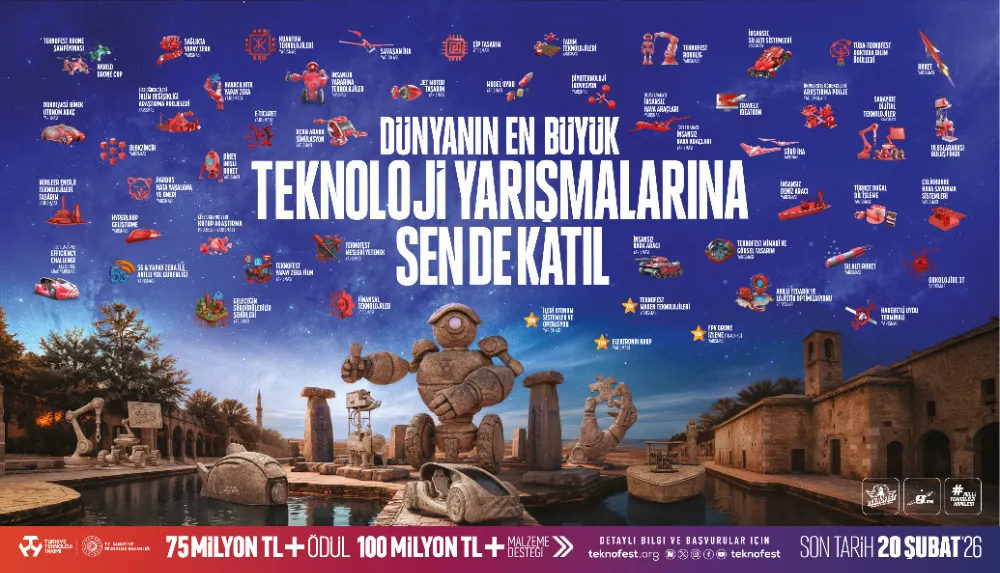 T3 Vakfı ve T.C. Sanayi ve Teknoloji Bakanlığı ana yürütücülüğünde, Türkiye’nin önde gelen teknoloji şirketleri, kamu, medya kuruluşları ve üniversitelerin destekleriyle düzenlenen dünyanın en büyük havacılık, uzay ve teknoloji festivali TEKNOFEST, 2026 yılında Şanlıurfa’da teknoloji severlerle buluşmaya hazırlanıyor. Festival coşkusunu ülkemizin her köşesine ulaştıran ve "ilklerin tek festivali" TEKNOFEST’in teknoloji yarışmalarına katılmak için www.teknofest.org adresinden başvurularınızı yapabilirsiniz.