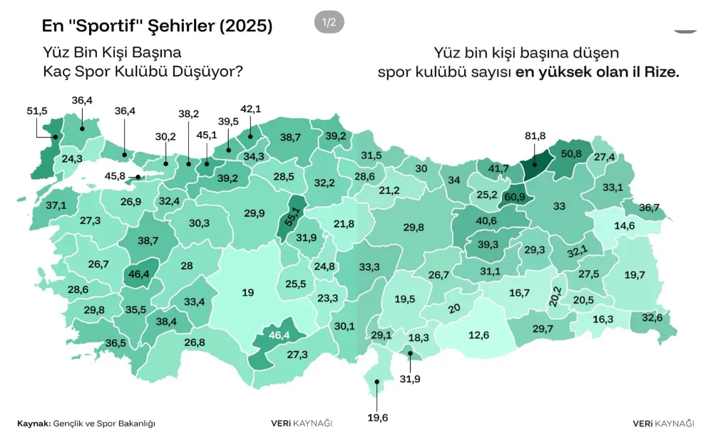 Gençlik ve Spor Bakanlığı verilerine göre yüz bin kişi başına düşen spor kulübü sayısında Rize, 81,8 oranıyla Türkiye’de ilk sıraya yerleşti.