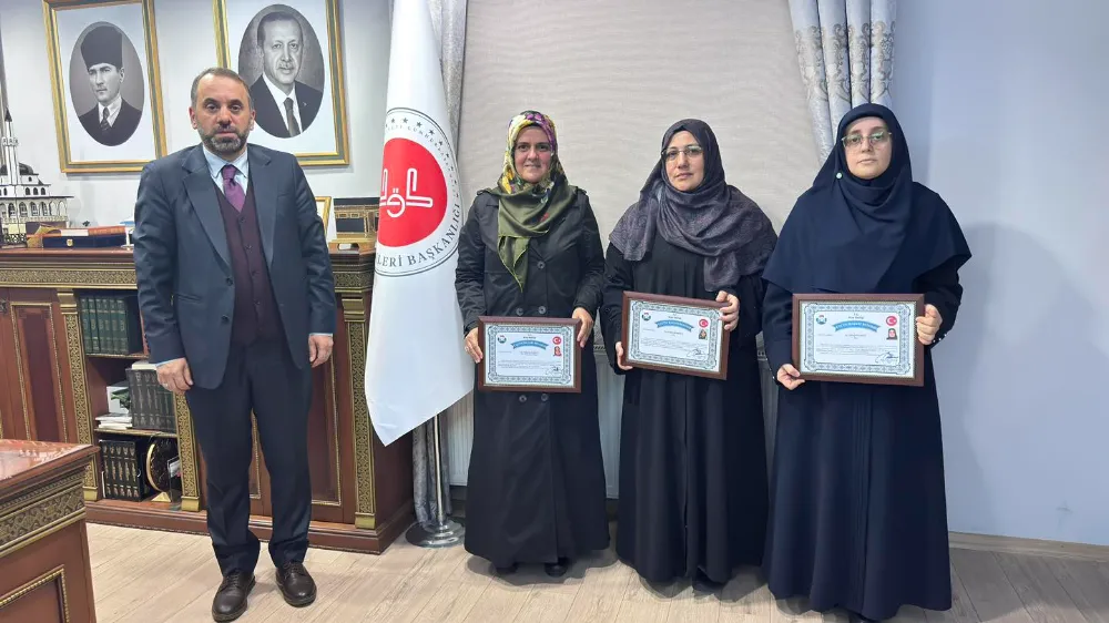 İl Müftülüğü çalışanlarından İl Vaizleri Şefahat Araboğlu ve Fatma Kuloğlu ile Din Hizmetleri Uzmanı Niğmet Çalışkan’a, görevlerinde göstermiş oldukları çalışmalarından dolayı İl Müftüsü Naci Çakmakçı tarafından üstün başarı belgesi verildi.