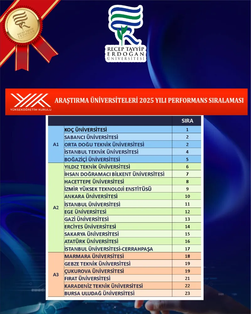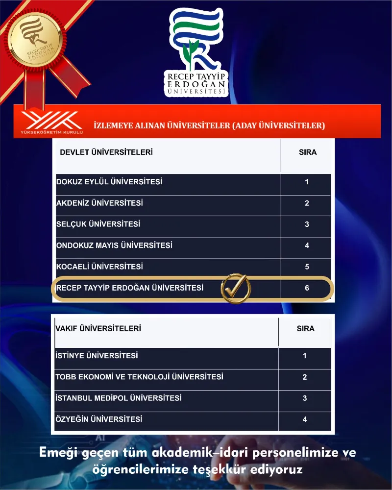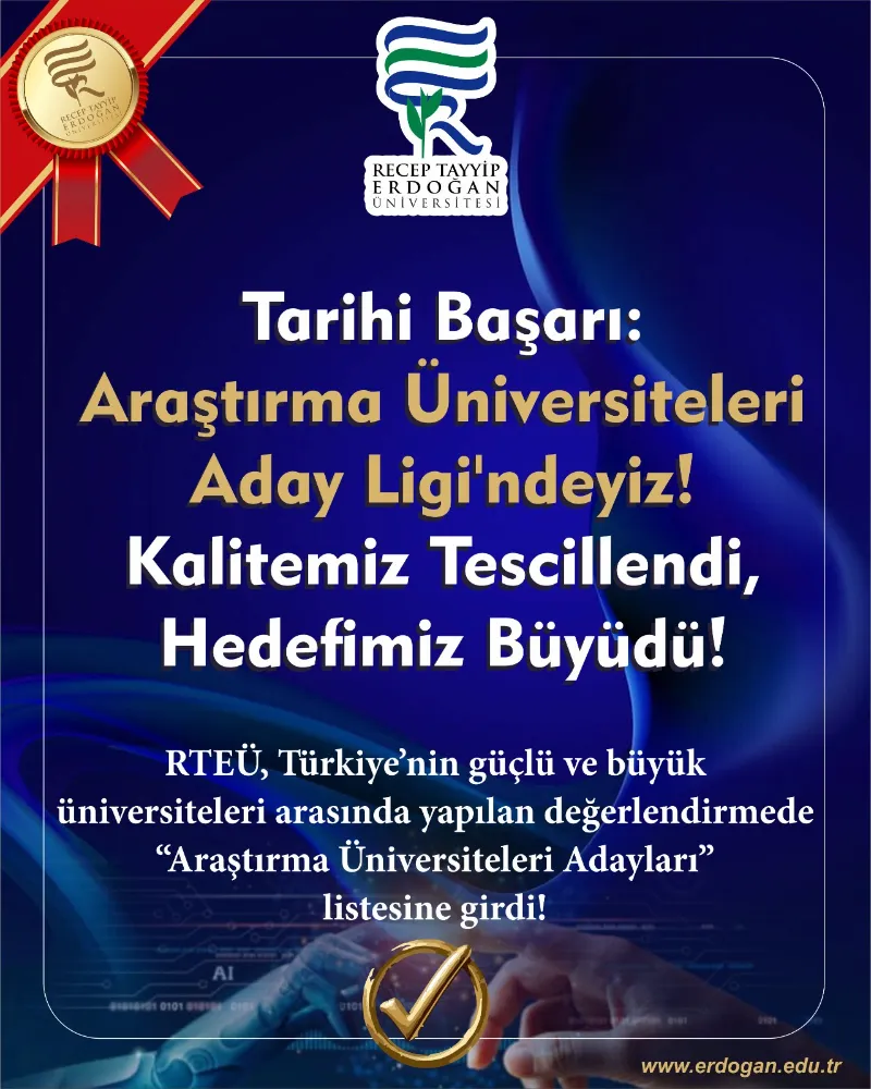 Yükseköğretim Kurulu tarafından açıklanan 2025 Yılı Araştırma Üniversiteleri Performans Sıralaması sonuçlarına göre RTEÜ, “Araştırma Üniversitesi Adayı” olarak izlemeye alınan üniversiteler listesine girdi.